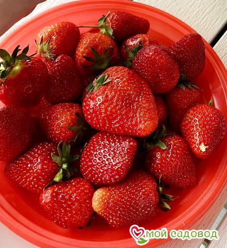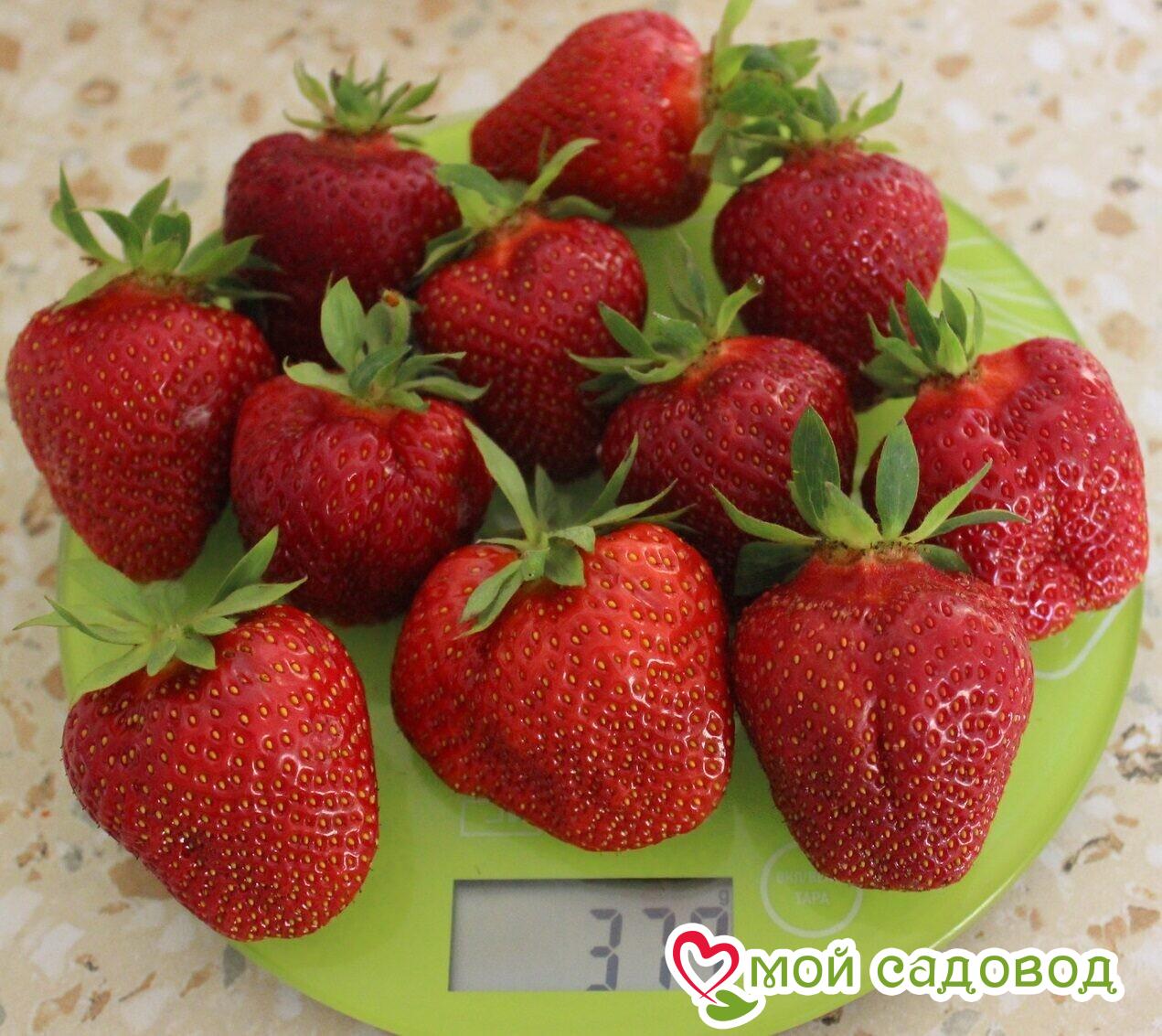 Зрелые плоды становятся тёмно-красными. При крупных размерах ягоды весят от 25 до 45 граммов. Форма – правильная, коническая. Внутри клубники отсутствуют пустоты. Мякоть плотная и сочная. На протяжении всего периода плодоношения урожай сохраняет форму и размеры. Хорошо переносит длительные транспортировки. Не нуждается в особых подкормках, не требователен к почвам.