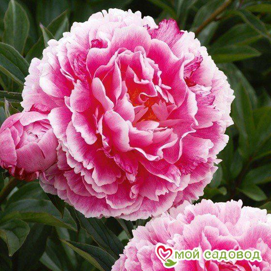 Кёнингин Вильгельмина (Paeonia Koningin Wilhelmina) — Цветок густомахровый, с воронкой в центре, светло-розовый с насыщением в глубине. Тонкий аромат