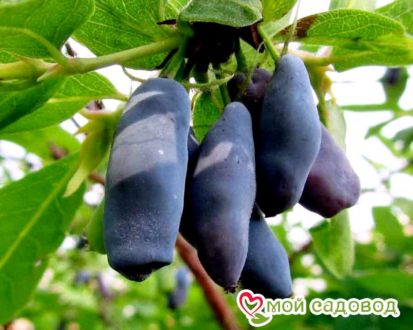 Ленинградский великан — чудесный сорт отечественной селекции, характеризуется крупными темно-синими ягодами длиной до 4 см. Средняя масса каждой — от 1,3 до 1,5 граммов. Форма удлиненная, с круглым основанием, плоской верхушкой. Покрытие сизым восковым налетом – среднее. Кроме того, неприхотливое и выносливое взрослое растение (при достижении возраста 5-6 лет) способно поразить своими урожаями. Один куст способен дать до 3 кг отборных спелых ягод; максимальный показатель – около 5 кг. Плоды созревают неравномерно, с середины июня по конец июля. На ветвях располагаются крупными гроздьями, по причине чего легко собираются. Осыпаемость слабая. В ягодах жимолости очень много витаминов и минералов. В ягодах содержатся витамины: В1, В2, В9, С, Р, А. В состав ягод входят лимонная, щавелевая, яблочная и янтарная кислоты, пектины, дубильные вещества. Наконец, очень много микроэлементов: калия — 70 мг, магния — 21 мг, фосфора — 35 мг, кальция — 19 мг, натрия — 35 мг, йода — 90 мкг. Многие витамины и элементы находятся в соединениях, усиливающих действие друг друга.